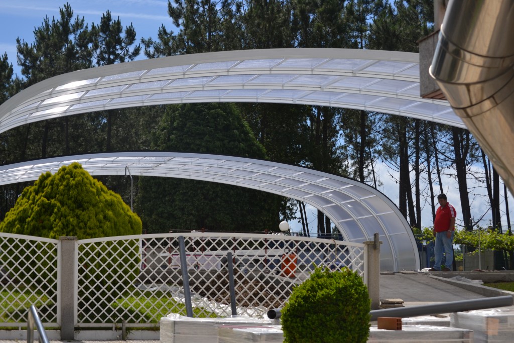 Las cubiertas telescópicas son cubiertas compuestas por módulos deslizantes de policarbonato compacto transparente y anchura de hasta 14,00 m. Un módulo permanecerá fijo al suelo y el resto serán telescópicos para poder introducirlos todos bajo el fijo. Esta la instalamos en el Hotel El Pinar Sanxenxo, Pontevedra, de medidas de 29 x 26 metros. En Aquatic nos encargamos de todo las cubiertas son llave en mano, incluida la obra civil.